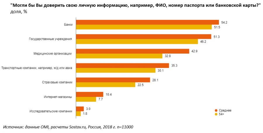 Перечисленные варианты описывают практически полный спектр вариантов: доля респондентов, отметивших пункт «другое» очень мала — на уровне 1,5%. А вот тех, кто никогда не задумывался о безопасности личной информации достаточно много: в среднем 8,6% от общего числа ответивших, и 6,9% в группе людей старше 54 лет. А ведь со временем задумаются и они.