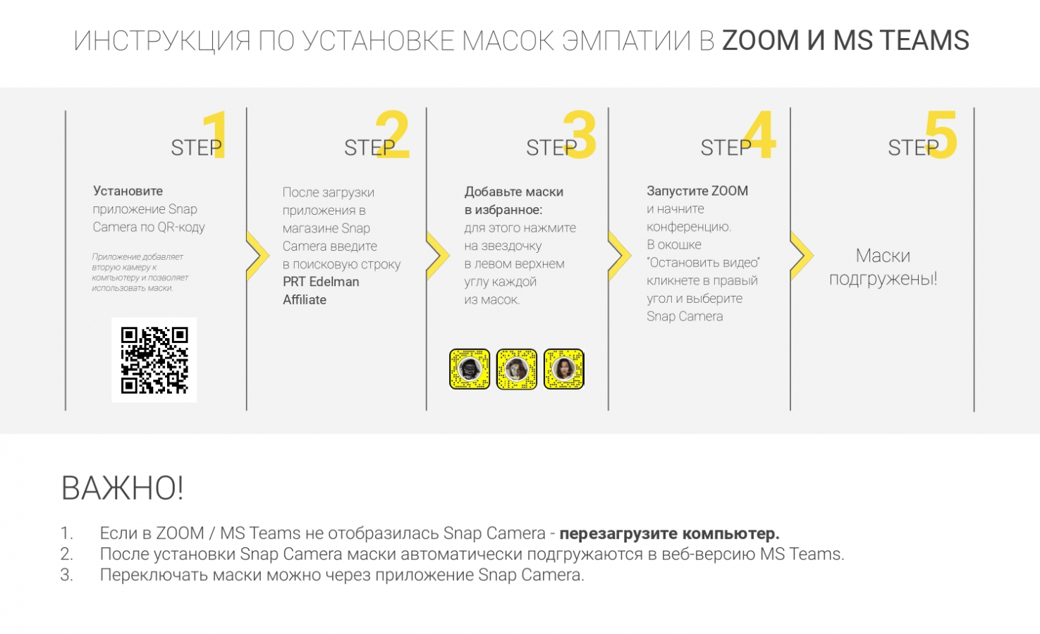 Коммуникационное агентство PRT Edelman Affiliate и медиахудожник Антон Бунденко из Futureisnown выпустили коллекцию AR-масок эмпатии для Zoom и Snapchat. Digital-проект раскрывает три аспекта эмоционального интеллекта, который приобрел особенный статус в период постпандемии и трансформации социальных процессов, в том числе рабочих. Команда PRT рассказала об идее и назначении масок.