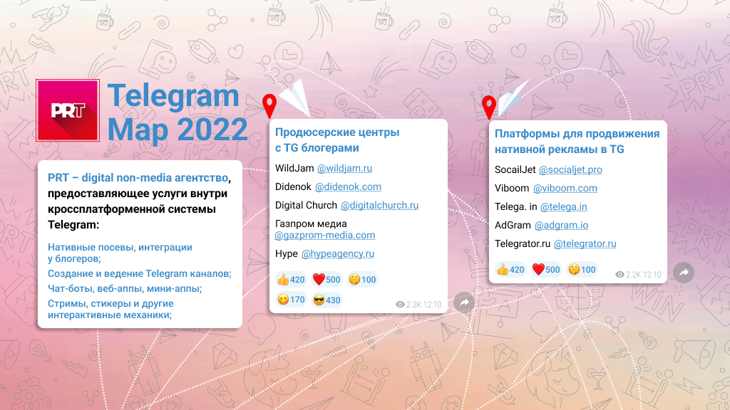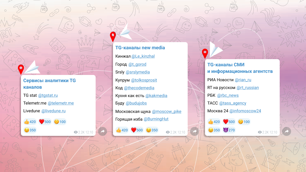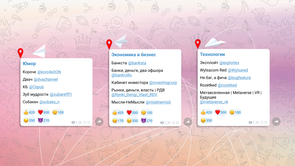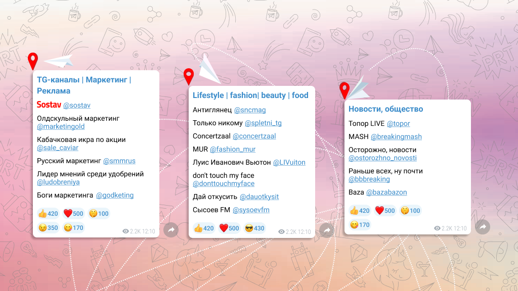 PRT и Sostav составили карту ключевых российских Telegram-каналов. Каналы распределили по десяти тематическим категориям: