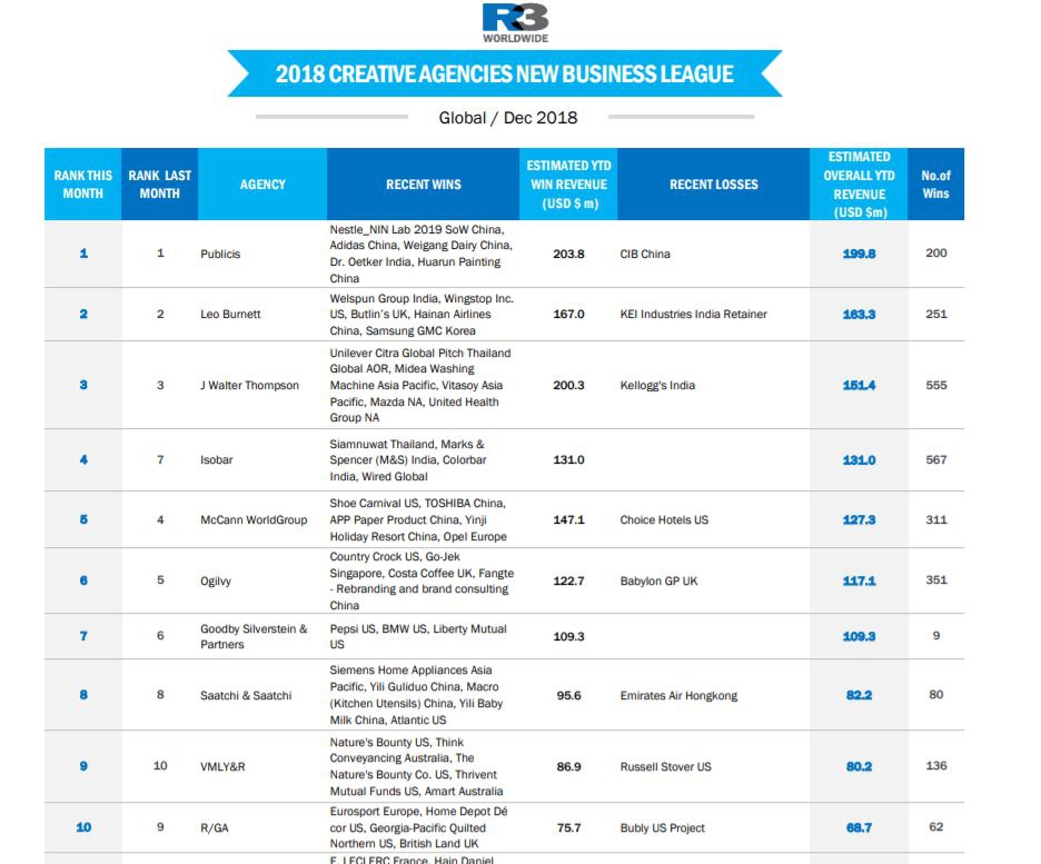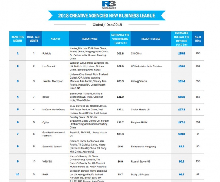 Рекламодатели провели на 5,5% меньше пересмотров в 2018 году, однако выручка агентств от привлечения нового бизнеса выросла на 7,5%. Лидером среди рекламных холдингов стала Publicis Groupe. Консалтинговая компания R3 оценивает доход группы от выигранных тендеров в 736,4 млн долларов. Основной вклад в эту сумму внесла победа в ревью Mercedes-Benz. Publicis Groupe стала глобальным рекламным и digital партнером автобренда и ради нового клиента создала агентство Publicis Emil.