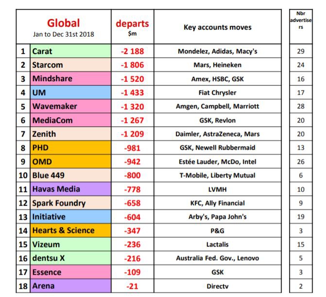 Среди групп первое место заняла Publicis Media, завершившая год с положительным балансом в 1,25 млрд долларов, тогда как Dentsu Aegis Network (DAN) — с негативным в размере 800 млн долларов. У конкурентов IPG Mediabrands и GroupM баланс в плюсе.