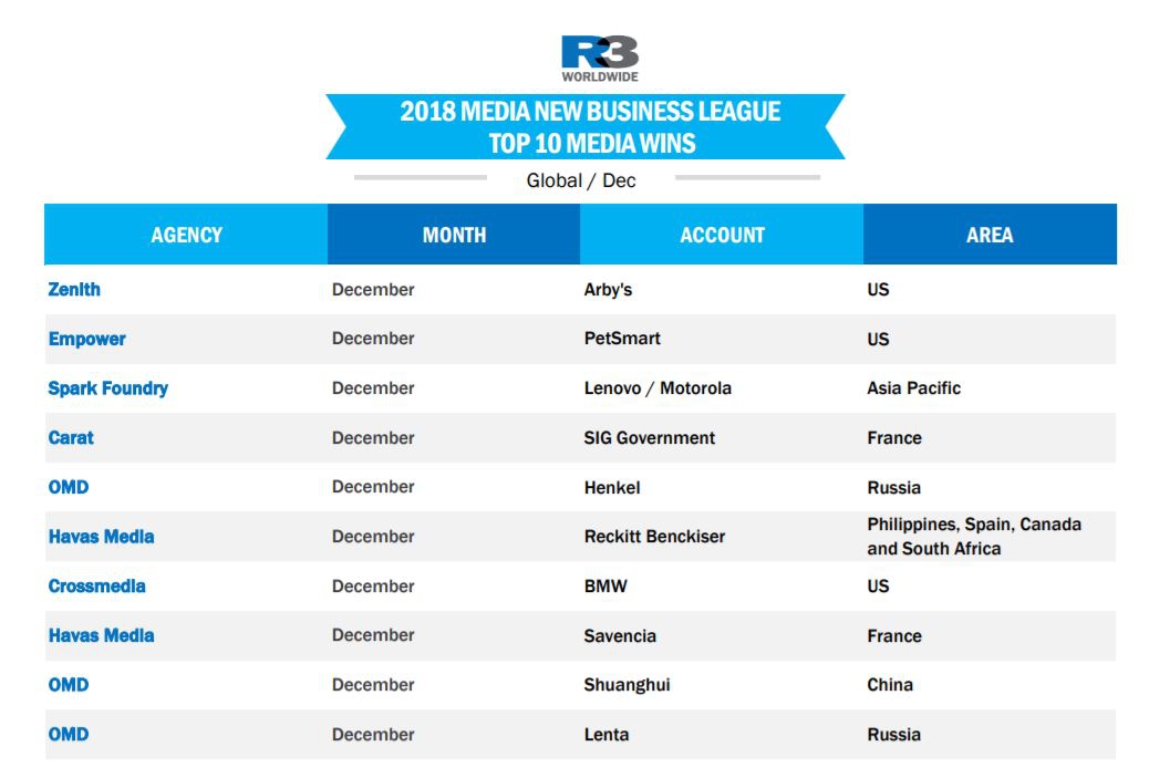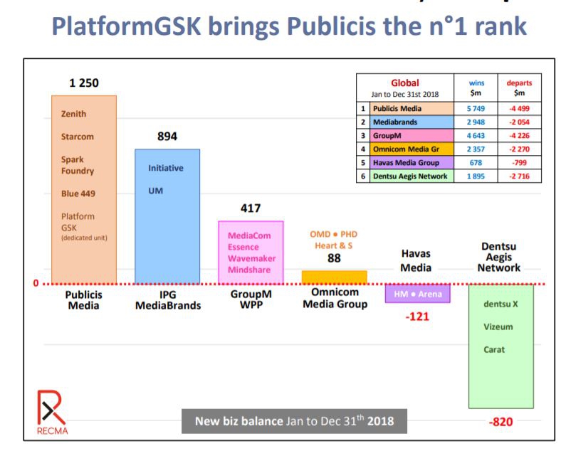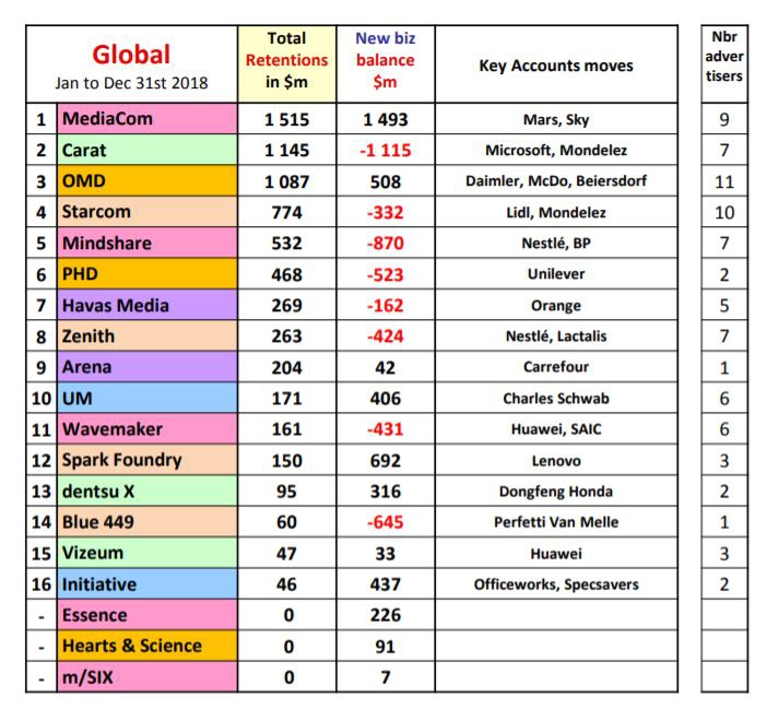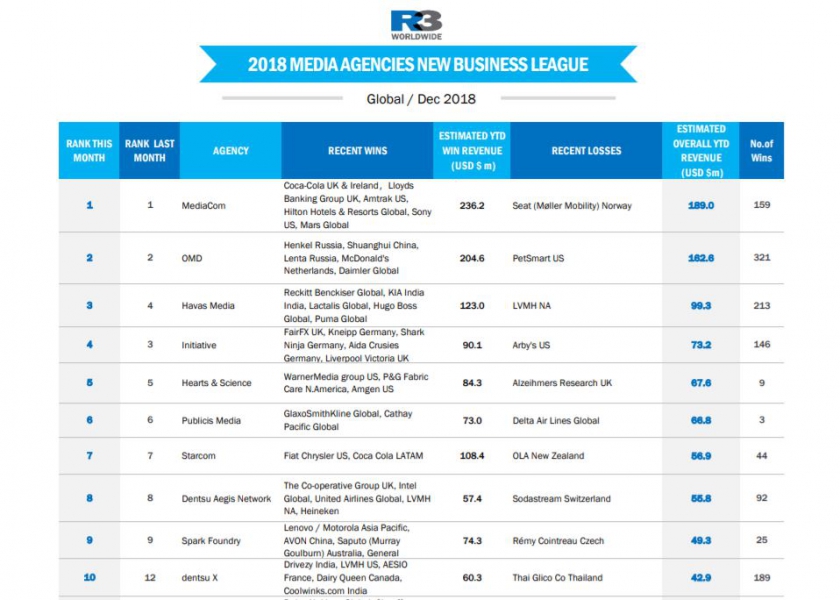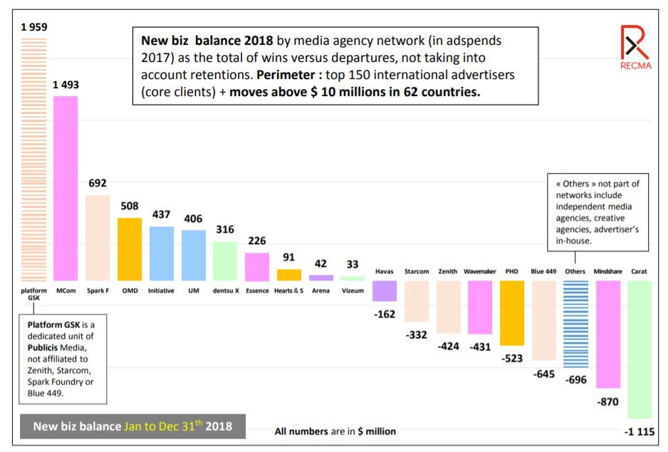 Аналогичный расклад наблюдается в рейтинге RECMA, который отражает баланс медиаагентств между выигранными и упущенными аккаунтами. По оценке экспертов, в 2018 году объем пересмотров составил 20,4 млрд долларов. Самым успешным агентством по привлечению нового бизнеса и сохранению текущего клиентского портфеля названо MediaCom. Согласно подсчетам RECMA, агентство выиграло 27 новых тендеров на сумму 2,8 млрд долларов и потеряло 20 аккаунтов на 1,3 млрд долларов. В 2018 году международной сети удалось заполучить таких крупных клиентов, как Mars, Adidas, Bose, Hilton. Одновременно компания сохранила аккаунты Shell и Sky в Великобритании.
