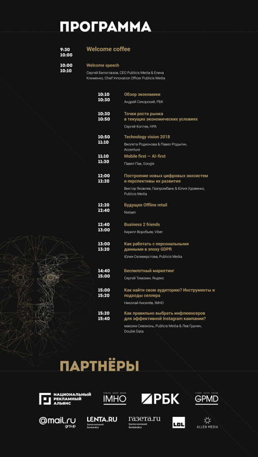 В основу презентации легли ключевые тезисы 12 выступлений спикеров — топ-менеджеров крупнейших игроков медиа-рынка, таких как: Национальный Рекламный Альянс, Nielsen, РБК, Accenture, IMHO, Google, Viber, Яндекс и другие. В этом году основными темами конференции стали: retail, потребитель, технологии и медиа.