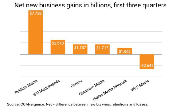 IPG Mediabrands, недавно прекратившая самостоятельное существование после завершения слияния Omnicom и IPG, заняла второе место с приростом в $ 2,5 млрд — в основном благодаря сильным результатам в США.