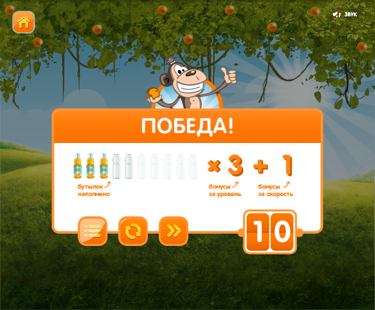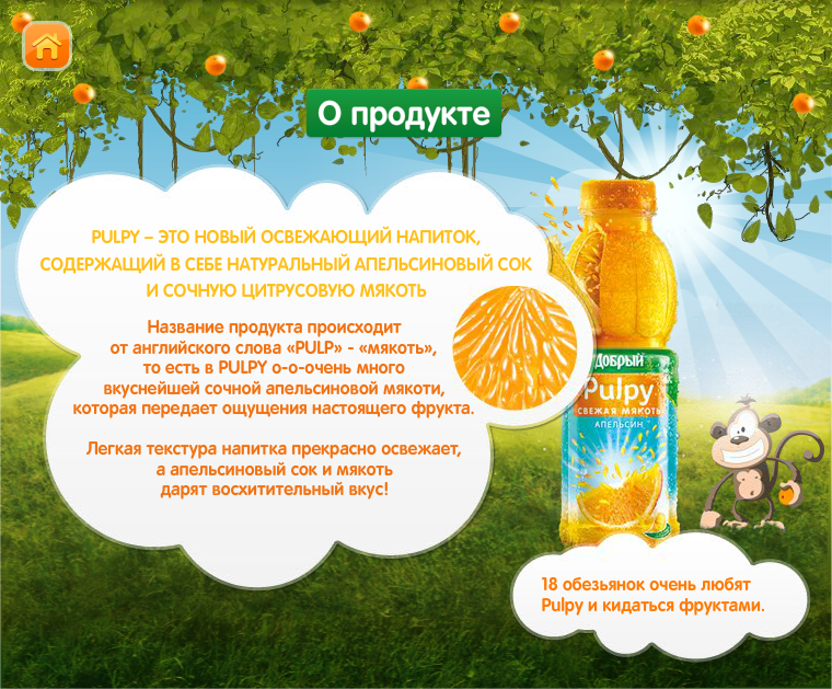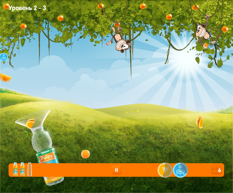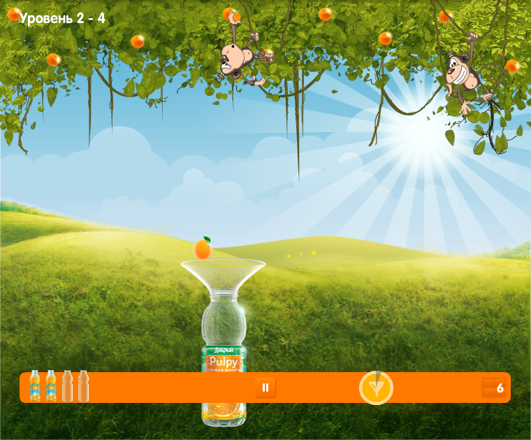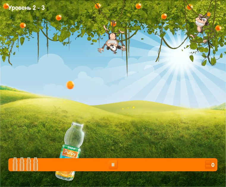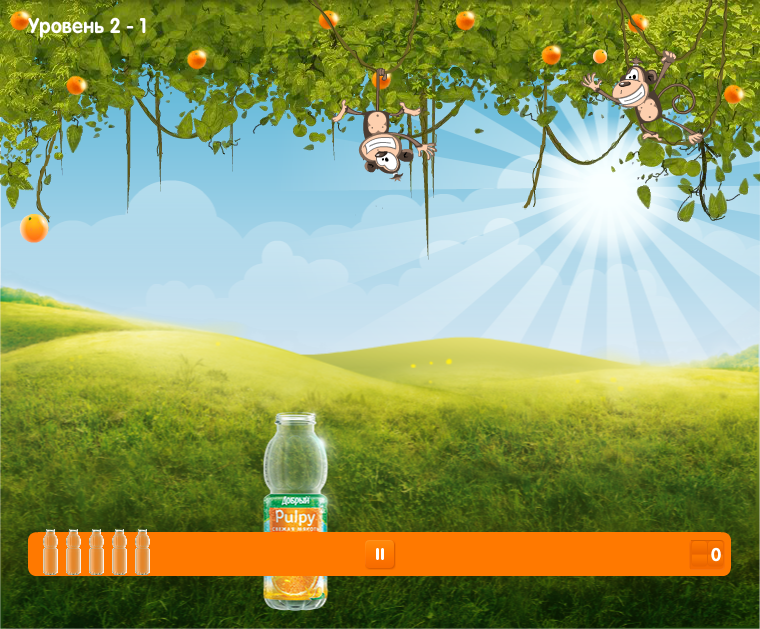 Главные персонажи игры – забавные обезьянки, которые не только любят Pulpy, но и не прочь пошалить, разбрасывая фрукты. Задача игрока – поймать все апельсины, подставляя под них бутылочки.