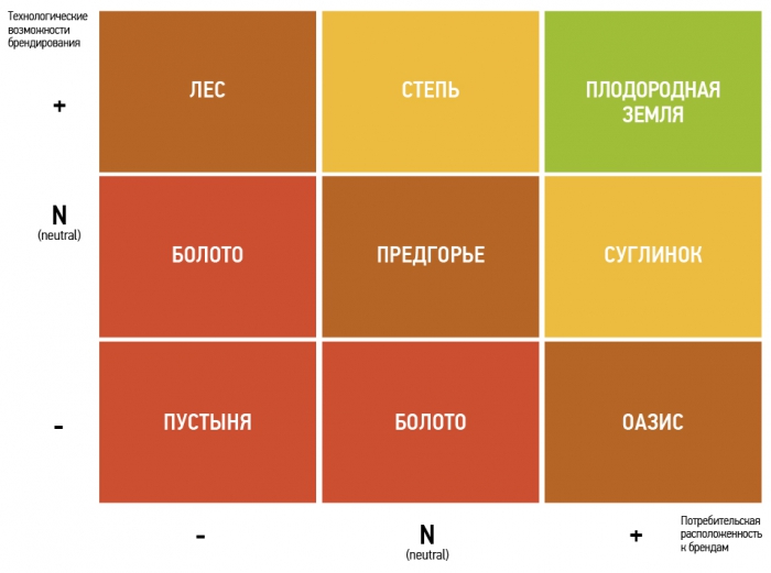Потребительская расположенность к брендам и технологические возможности брендирования, взятые за координатные оси образуют карту с 9 типами рынков, значительно различающихся по уровню, потенциалу, особенностям брендирования и базовым эффективным бренд-стратегиям.