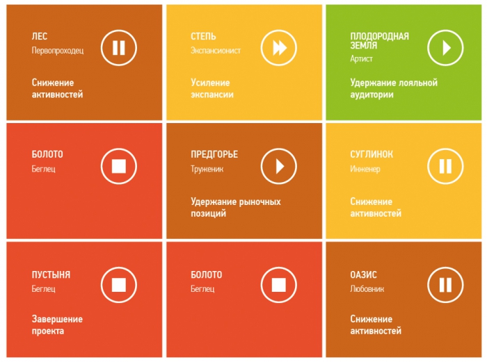 Так, в «плодородной земле» (напитки, снеки) конкуренция высока, а спрос в значительной степени «разогрет» брендингом. Поэтому даже в условиях рецессии необходимы коммуникации для удержания лояльной аудитории. В новых продуктовых категориях - «лесах» и «суглинках» (функциональные продукты питания, фаст-фуд) потребительский интерес к новинкам будет слабеть, здесь целесообразно перейти в режим разумной экономии.
