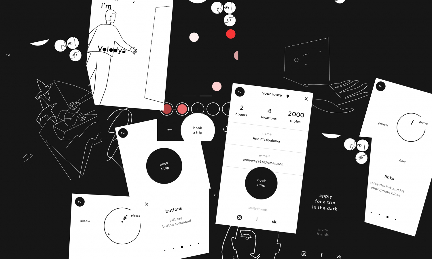 Пользователь сталкивается с непривычными способами взаимодействия с интернет-средой — голосовые команды, аудиометки, ориентация в трёхмерном пространстве. Чем дольше мы исследуем сайт, тем понятнее становится окружающая темнота. Шорох, шум, гул, капель, клаксон превращаются в новые ориентиры. В «корзину» можно сложить звуки реальных мест города, чтобы создать индивидуальный маршрут и забронировать необычную прогулку.