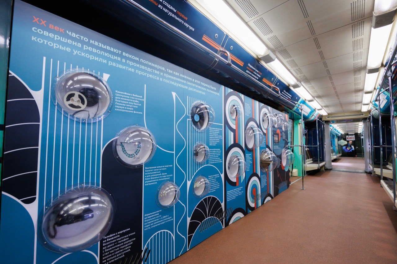 Креативный проект в виде оформленного поезда с исторической выставкой был направлен на две категорий пассажиров метро — те, кто едут на длительные дистанции и те, кто в метро для короткой поездки. Инсталляция разработана таким образом, что в короткие поездки пассажир может узнать интересные факты на внутренней оклейке вагона, а в более длительный промежуток времени проследить историю развития полимеров в разные периоды времени благодаря инсталляциям на стенах с артефактами разных эпох.