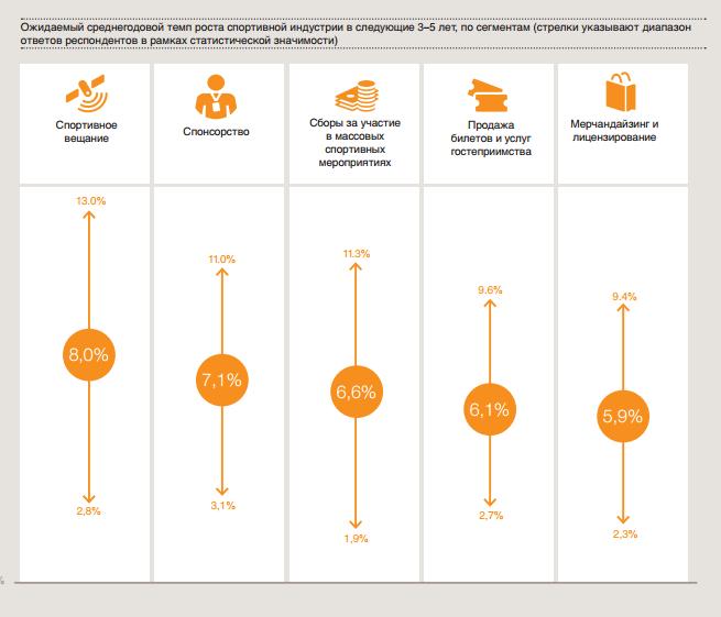 В ближайшие три-пять лет доходы глобальной спортивной индустрии будут расти. Наибольший рост доходов опрошенные ожидают от спонсорства (на 7,1%) и реализации медиаправ (на 8%). Представители сегмента телевещания дали наиболее пессимистичные прогнозы темпов развития собственного сегмента — рост на 5,6%.