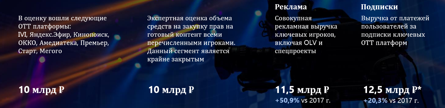 Суммарный объем рынка производства и приобретения контента в России (ТВ, OTT, спорт, киберспорт, кинопрокат, музыка, контент для социальных сетей и branded контент) составил около 100 млрд рублей за 2018 год, а объем рынка дистрибуции контента — 434 млрд рублей, сообщается в исследовании рекламного холдинга