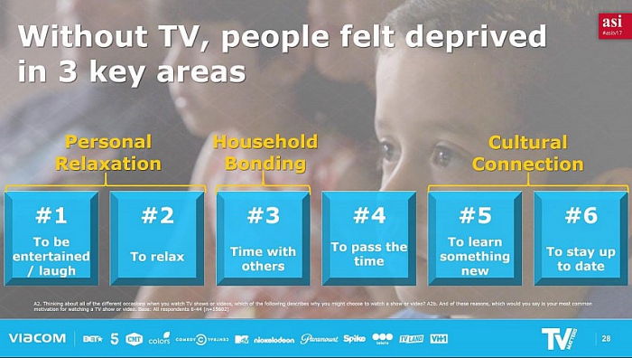 Причем респонденты были единодушны в том, что без просмотра видео по подписке им жилось гораздо легче, чем без возможности смотреть ТВ-контент тем способом, к которому они привыкли. Зрители назвали ТВ источником «мгновенного удовольствия» и отметили, что оно дает возможность собираться вместе, отвлекает от повседневной рутины, создает чувство новизны и включенности, «бодрости».