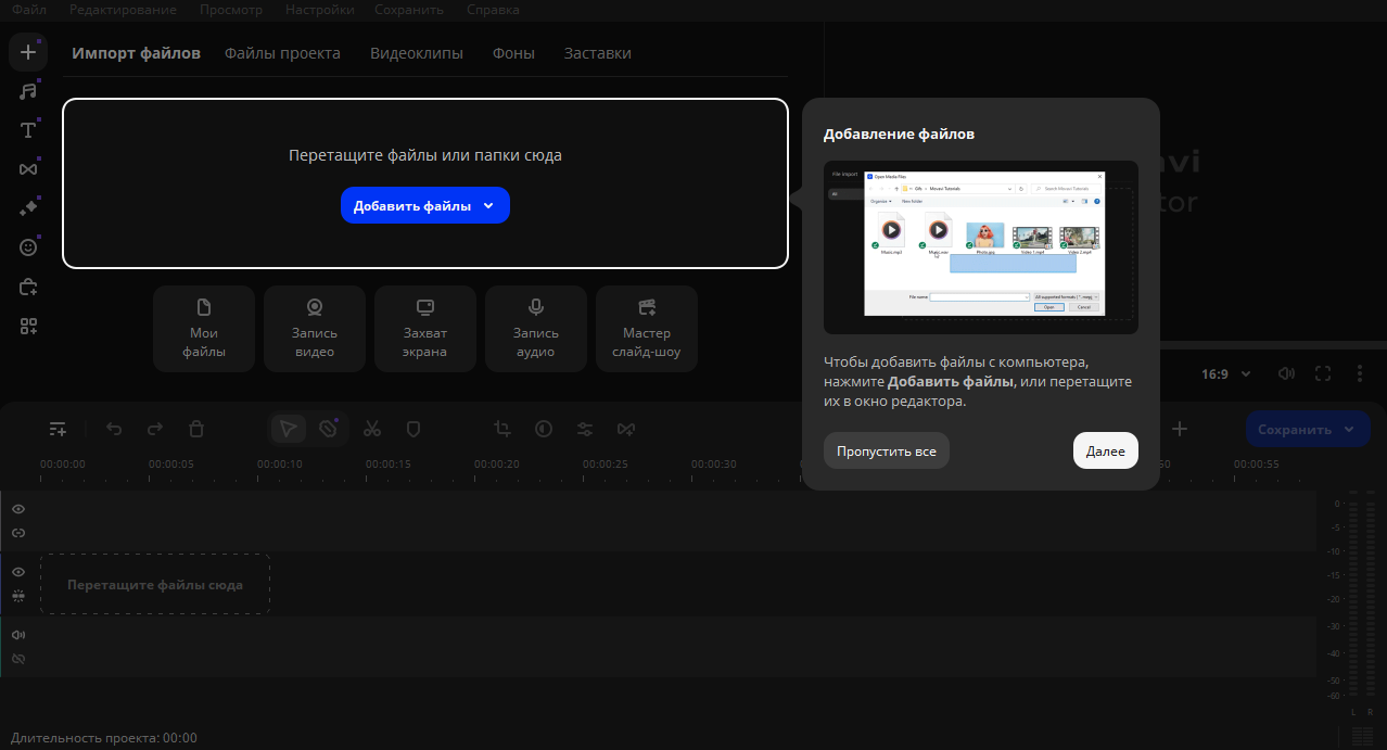 У софта «дружелюбный» интерфейс и минимальная визуальная нагрузка — в нем легко сможет работать даже новичок в монтаже. Кроме того, при первом запуске программа выводит контекстные подсказки, которые помогут освоиться с функциями.