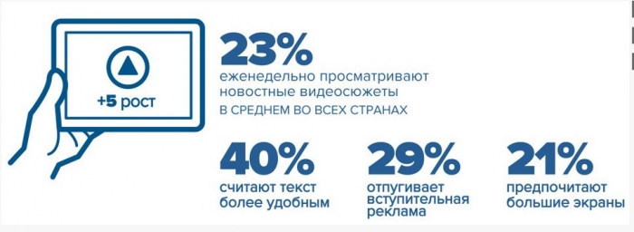 Интерес к видео контенту Reuters Institute объясняет тем, что этот формат получает все большее распространение в соцмедиа, а новостные редакции специально создают видео контент, адаптированных под интернет.