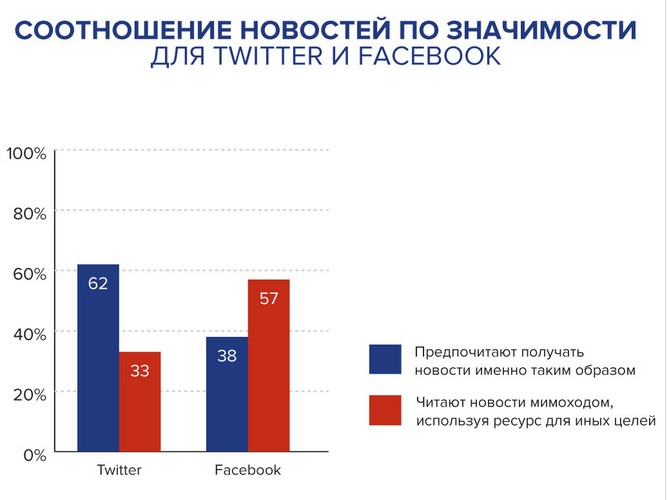 За Twitter закрепилась функция новостной площадки: 62% пользователей во всем мире используют сервис микроблогов для получения оперативной информации о последних событиях. В плане поиска и чтения новостей Twitter значительно опережает Facebook, который чаще используют для общения с друзьями, чем для потреболения новостного контента. Новости в соцсети ищут вдвое меньше людей, чем в сервисе микроблогов – всего 38% пользователей.