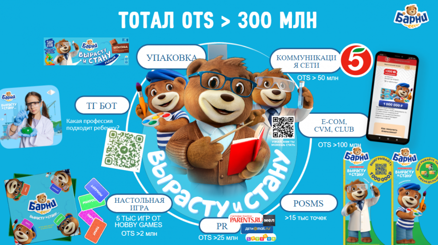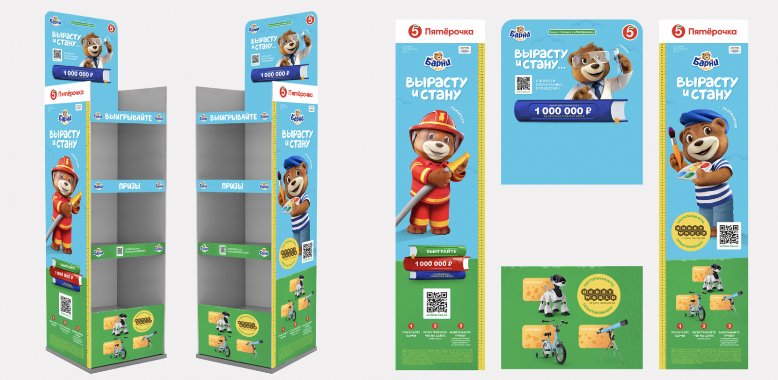 Чтобы помочь детям и родителям говорить о профессиях легко, с интересом и пользой, этим летом «Мон'дэлис Русь» и сеть магазинов «Пятёрочка» запустили совместный проект «Барни. Вырасту и стану» и подарили призы, чтобы сделать процесс просвещения более увлекательным и мотивирующим.