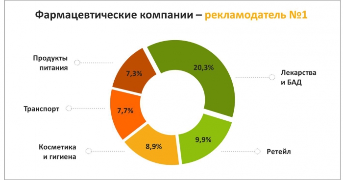 Категория «Лекарства и БАД» стала лидером по объему инвестиций в рекламу с долей 20% (по итогам первых шести месяцев 2015 г., по данным TNS):