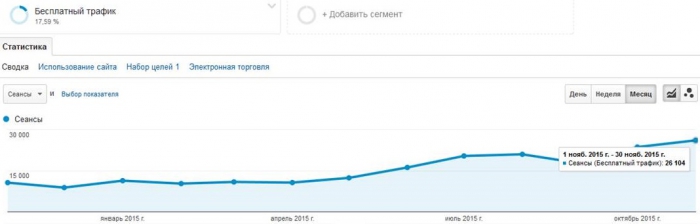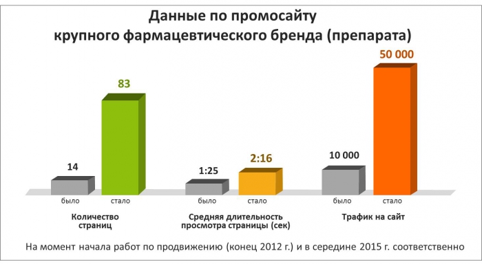 Приведем данные по промосайту лекарственного препарата крупного бренда после шести месяцев продвижения. За этот период, помимо стандартных работ по оптимизации и повышению узнаваемости бренда, было добавлено 30 новых страниц, для которых создан качественный релевантный контент. В результате трафик на сайт увеличился более чем в 2,5 раза – с 10 000 до 26 000 пользователей в месяц.
