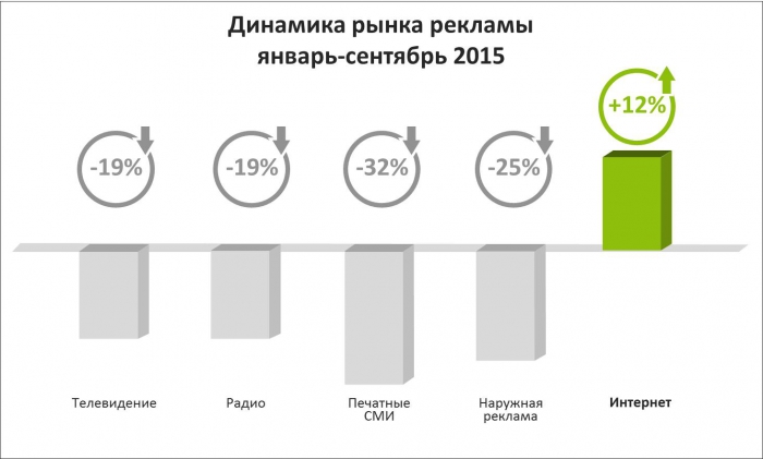 Что касается распределения бюджетов по рекламным каналам, по-прежнему лидирует ТВ-сегмент (79%). Однако в 2015 году он впервые показал отрицательную динамику по доле рынка, и причин тому несколько. Это и экономическая ситуация в целом, и увеличение объемов видеорекламы в сети, и рост других каналов интернет-маркетинга. Digital – единственный сегмент, который показывает положительную динамику по итогам первых девяти месяцев 2015 г. (по сравнению с аналогичным периодом 2014 г.).