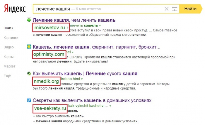 Какие сайты по запросу «лечение кашля» поисковая система выдаст в первую очередь?