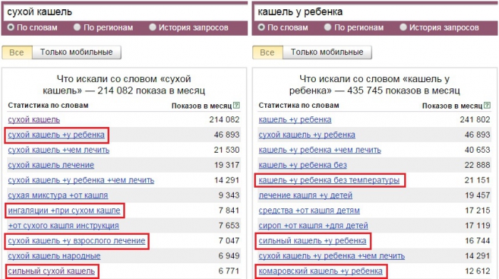 Чтобы обойти подобные ограничения, предоставьте пользователю максимально полную информацию о болезни. Мало описать симптомы и методы лечения. Актуальные темы можно посмотреть в Яндекс.Вордстате. Например, что ищут с запросами «сухой кашель» и «кашель у ребенка»: