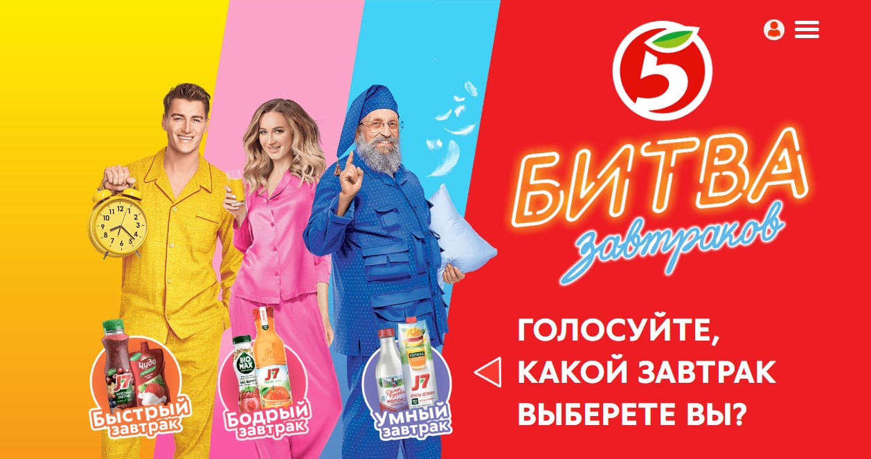 и PepsiCo запустили совместную акцию «Битва завтраков в «Пятёрочке»», главными героями которой стали Алексей Воробьёв, Анатолий Вассерман и Ольга Бузова. В рамках «Битвы» селебрити представляют свои завтраки — бодрый, быстрый и умный. Кампания стартовала 14 января и продлится до 31 марта.