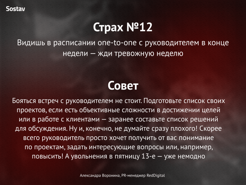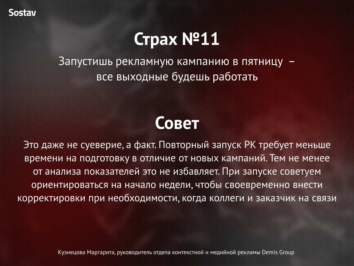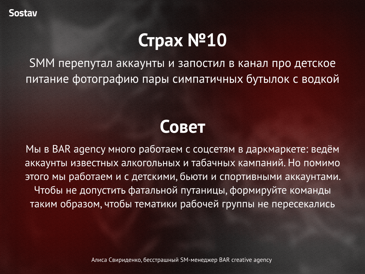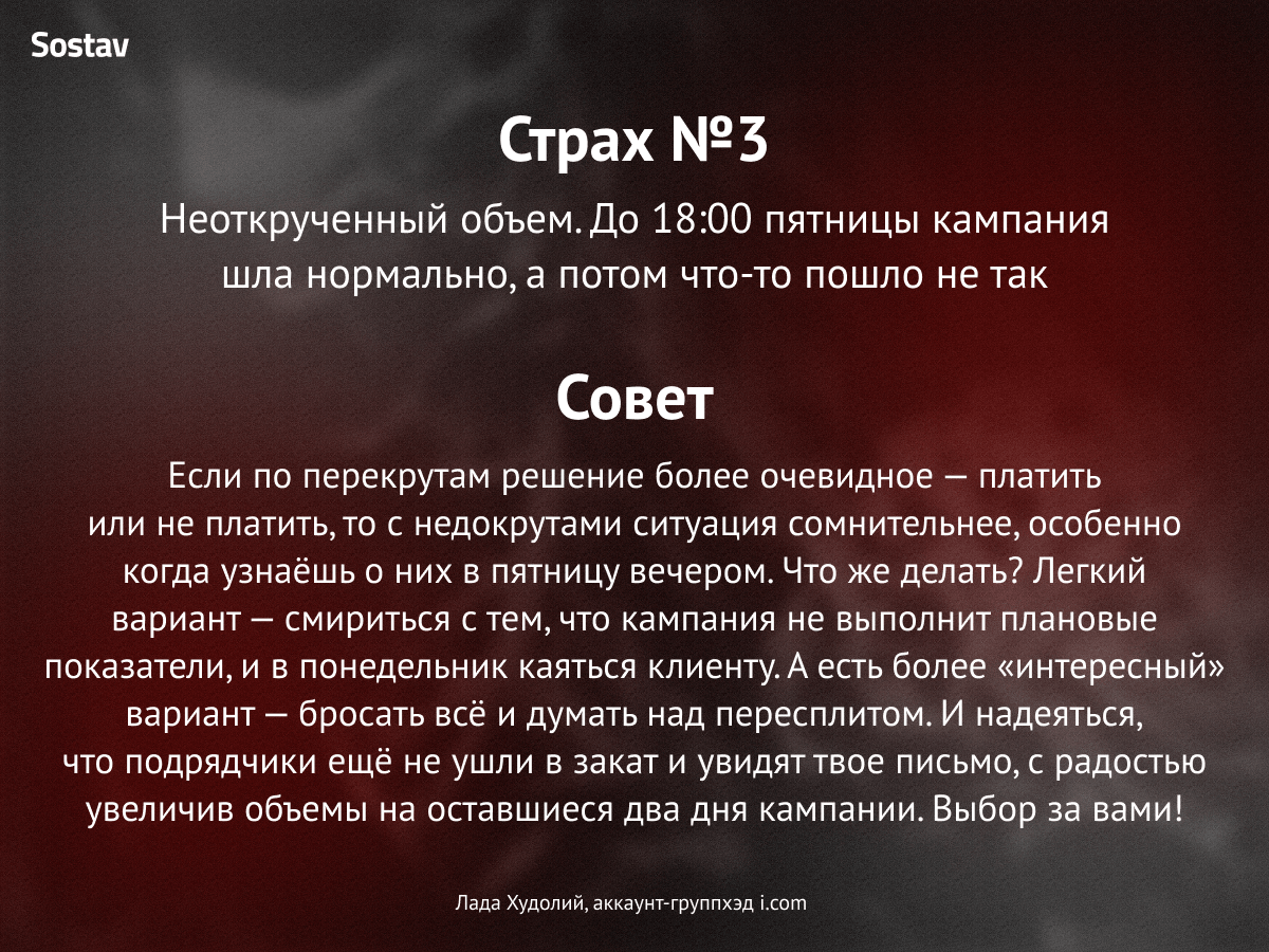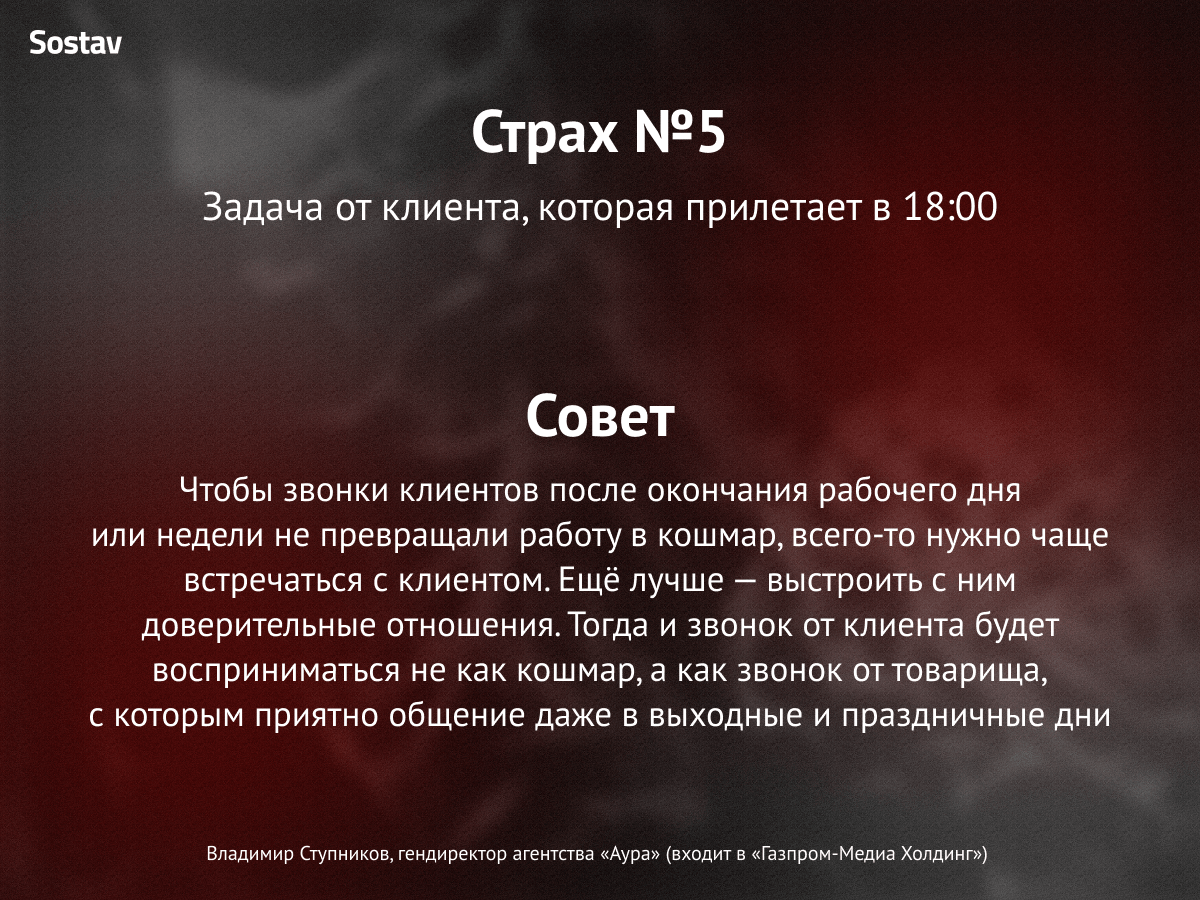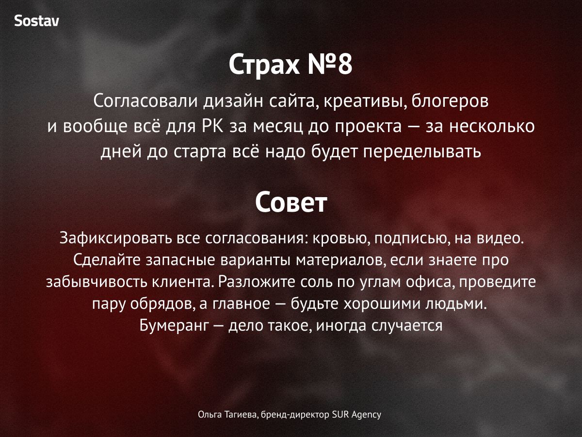 Вот такую леденящую кровь историю сочинил СЕО студии Digital Lab Максим Зайцев. Стало страшно? Нам тоже. Поэтому Sostav подготовил карточки, в которых агентства рассказали о своих самых ужасных профессиональных кошмарах и как они с ними справляются.