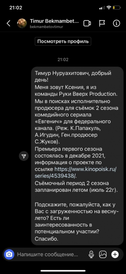 Накануне в соцсетях появились скриншоты личных переписок, в которых топовым российским продюсерам в Instagram-стилистике предлагалась летняя подработка на съёмках сериала «Евгенич» в должности младшего исполнительного продюсера. Такие сообщения получили Валерий Федорович, Евгений Никишов, Вячеслав Муругов, Тимур Бекмамбетов, Александр Роднянский, Эдуард Илоян, Вячеслав Дусмухаметов, Илья Найшуллер. Необычный хантинг стал вирусной промокампанией