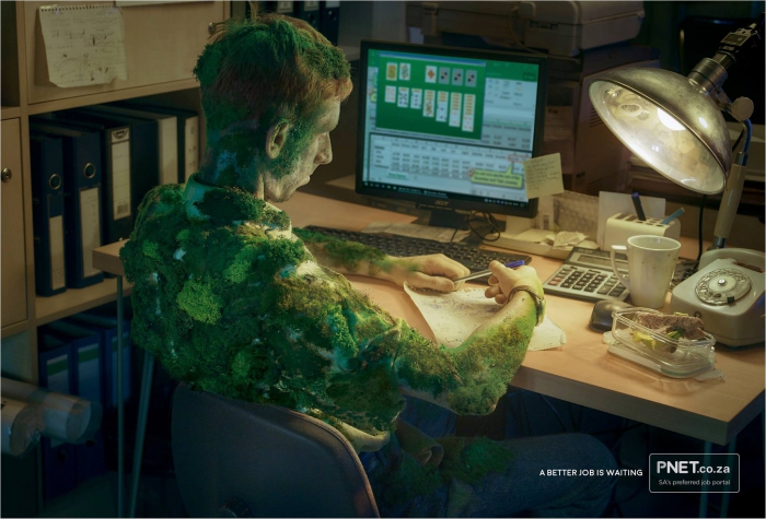 Слоган «Лучшая работа ждет» (A better job is waiting) обыгран серией принтов, на которых изображены сотрудники, покрытые пылью, плесенью и паутиной.