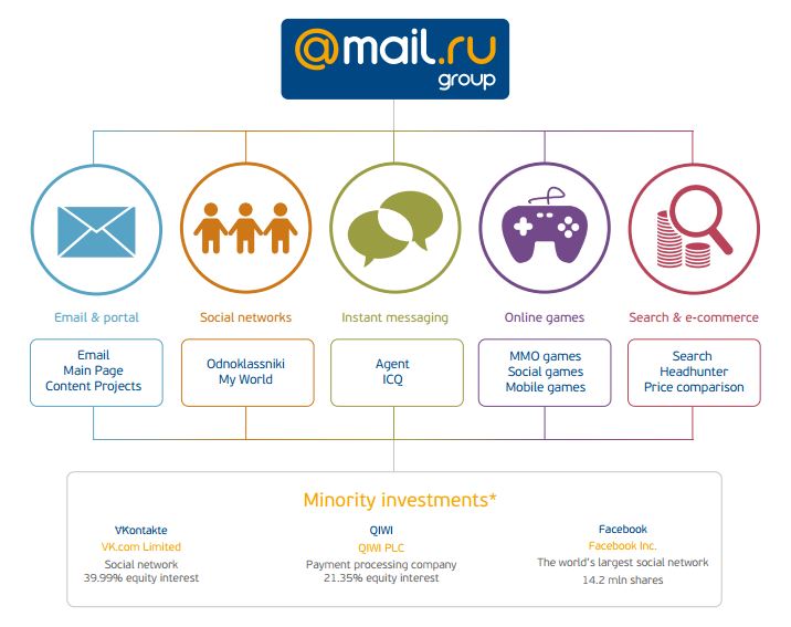 Доходы от всех компаний, аффилированных с Mail.ru Group, выросли в 8 раз, с 14 до 112 млн рублей. Согласно полной отчетности, на Qiwi и Haslop Company Ltd (портал Mamba) холдинг заработал 241 млн рублей. Однако их рост был частично компенсирован потерями от «ВКонтакте», Molotok и Nikita (владельца разработчика онлайн-игр Fun Factory), которые составили 129 млн рублей.