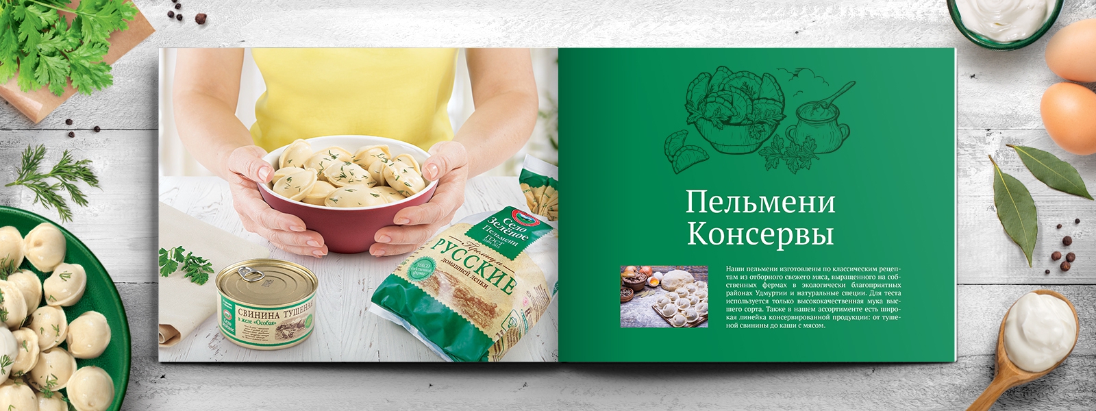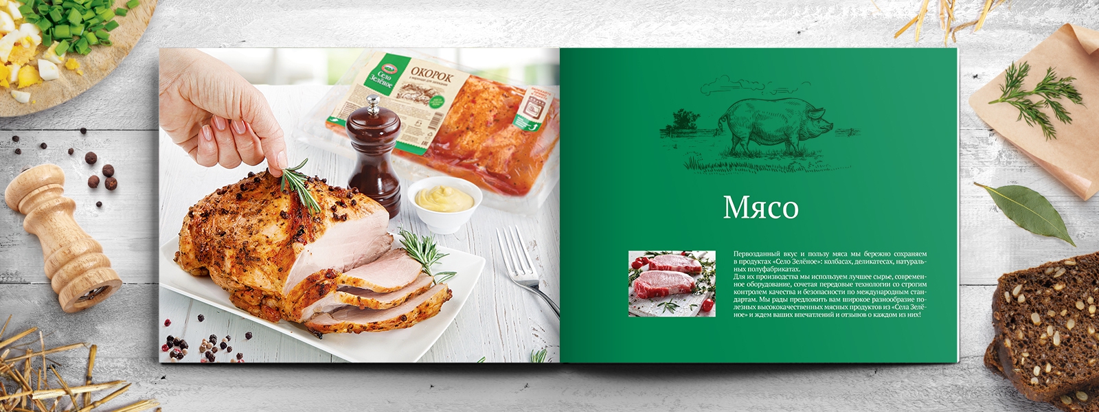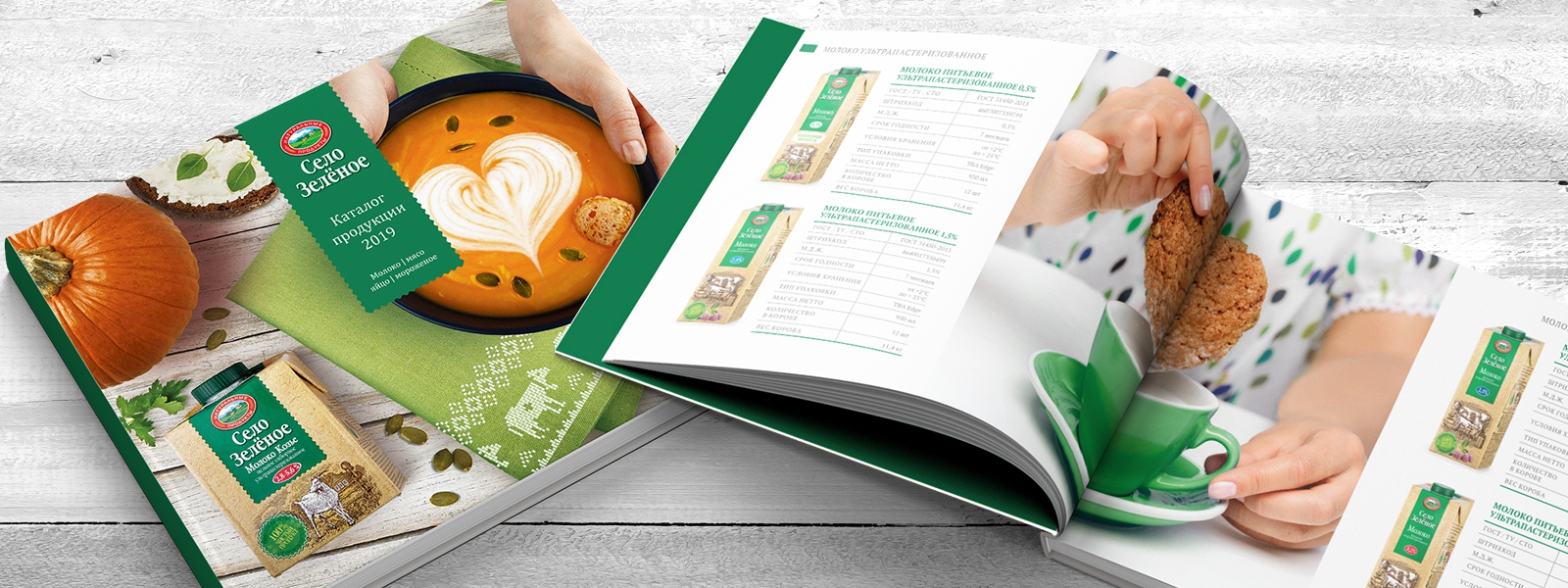 После выхода на рынок портфель бренда «Село Зеленое» постоянно расширялся и к 2019 году составил более 200 SKU в 20 продуктовых категориях, в связи с чем назрела задача по разработке каталога, включающего весь ассортимент. Для этого требовалось разработать идею и стилистику в соответствии со стилем и характером бренда, провести имиджевую фотосъемку для шмуцтитулов, отснять всю продукцию бренда и сверстать итоговый каталог.