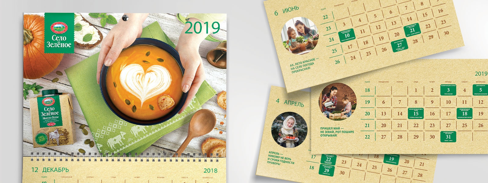 Это решение — самое оптимальное, эргономичное и прогрессивное, так как интегрирует ранее разработанный для клиента календарь, а также через образ человеческих рук пробуждает светлые чувства, позволяет показать бытовые сцены изготовления и потребления натуральной продукции для всей семьи.