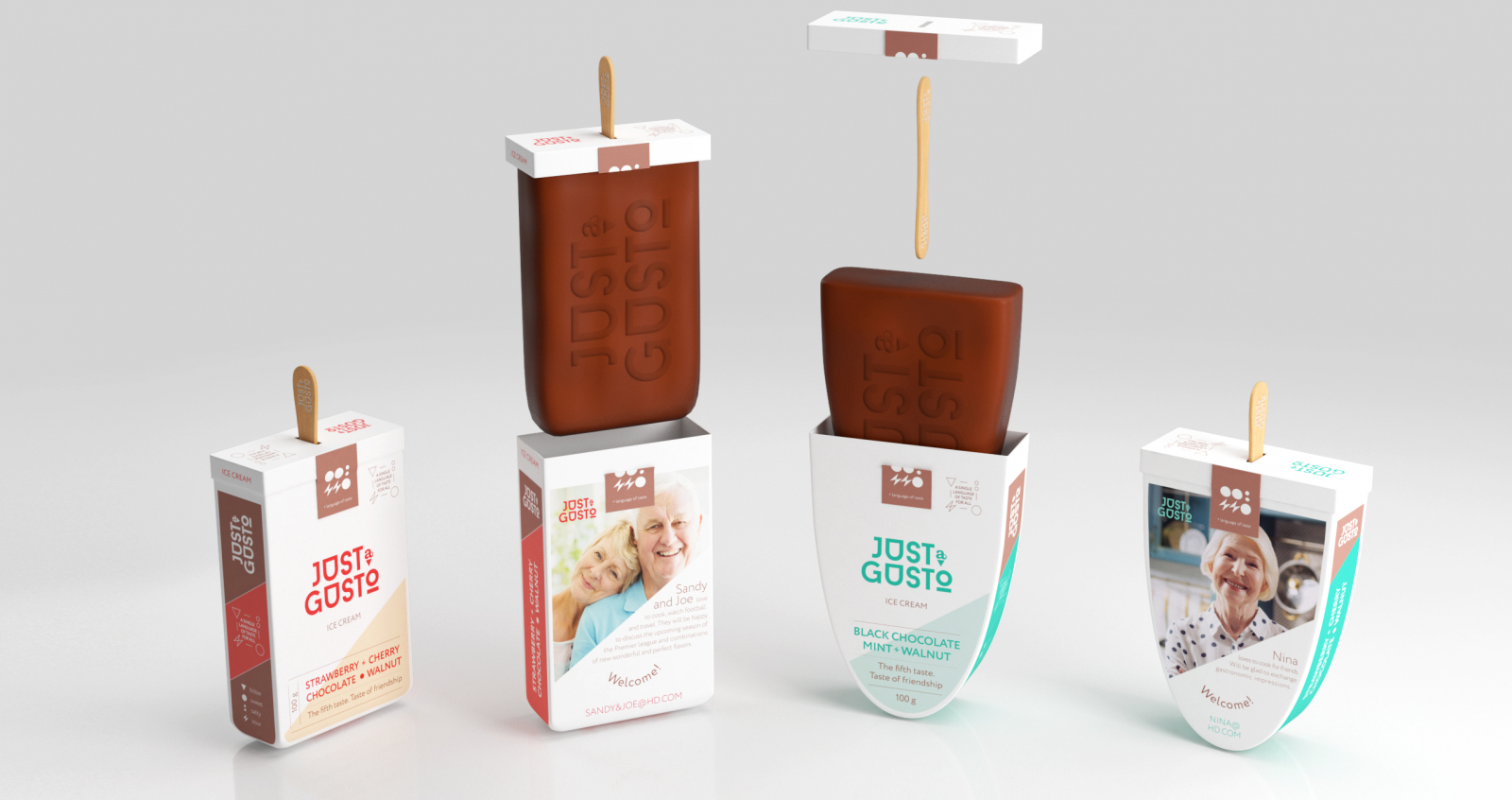 Разработать инновационную концепцию продукта и упаковки для мороженого, ориентированную на потребителя в возрасте 65 лет и старше. Согласно брифу заказчика, был возможен любой тип упаковки, формат, размер или материал, а также ситуация потребления (вне дома или дома). Новые упаковочные материалы, формы и экологичный выбор приветствовались. Кроме того, необходимо было сделать продукт удобным.