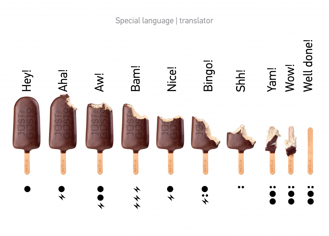 Логотип и знак представлены шрифтом, который с точки зрения графики находится на грани перехода в состояние символов, а предлог «а» напоминает рожок с мороженым. В фирменном стиле есть особые пиктограммы, которые раскрывают суть идеи — нового языка, где слова — это вкусы, а буквы — ингредиенты. И этот язык поймет каждый.