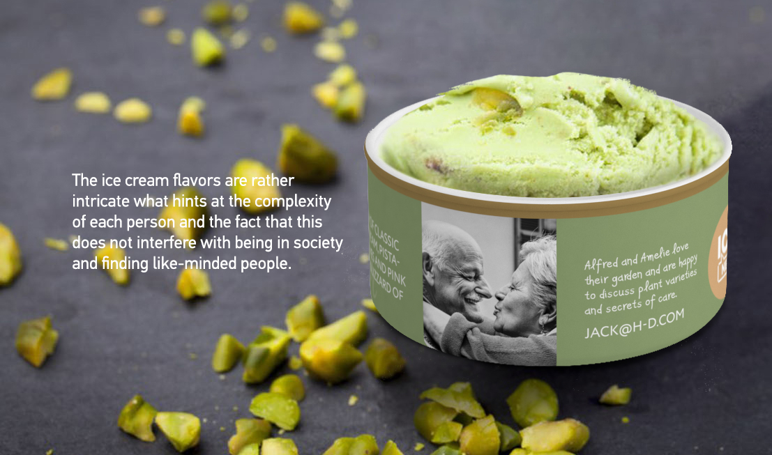 Вкусы мороженого довольно замысловатые — это отсылает к сложности каждой личности, возможности быть в обществе и найти единомышленников. Таким образом мы предлагаем идею объединения и помощи людям, которые хотят общаться больше.