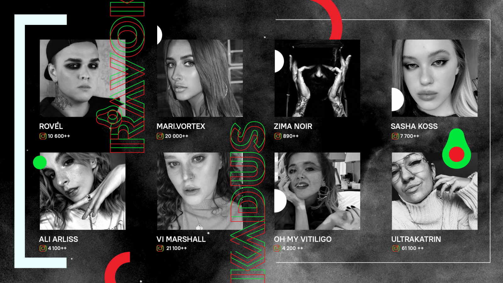 [R]AVOKADUS уже сейчас сотрудничает и с современными художниками, и с музыкантами, выделяя их подачу и творческую уникальность. Более того, команда проекта раскрывает потенциал молодых блогеров и помогает им развиваться, сохраняя свою идентичность.