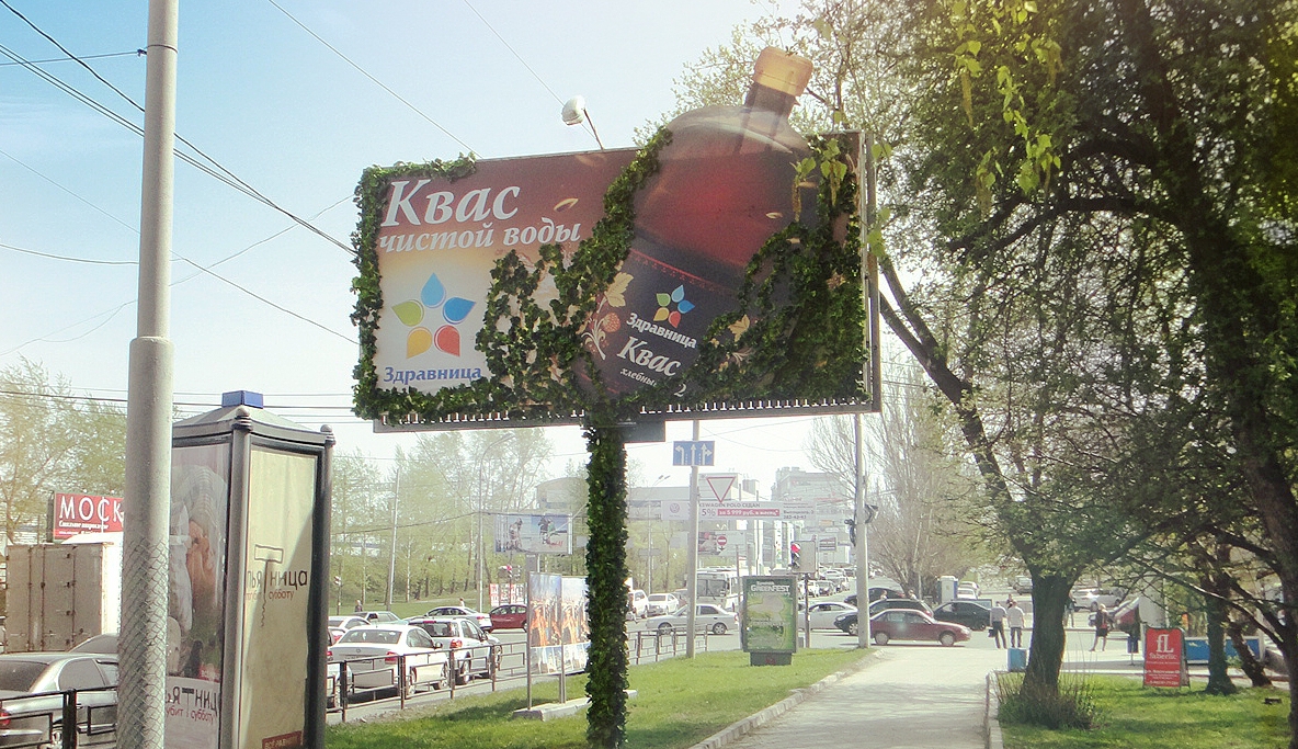 Зеленый билборд пришелся по вкусу горожанам и привлек дополнительное внимание к рекламе кваса «Здравница», говорят креаторы.