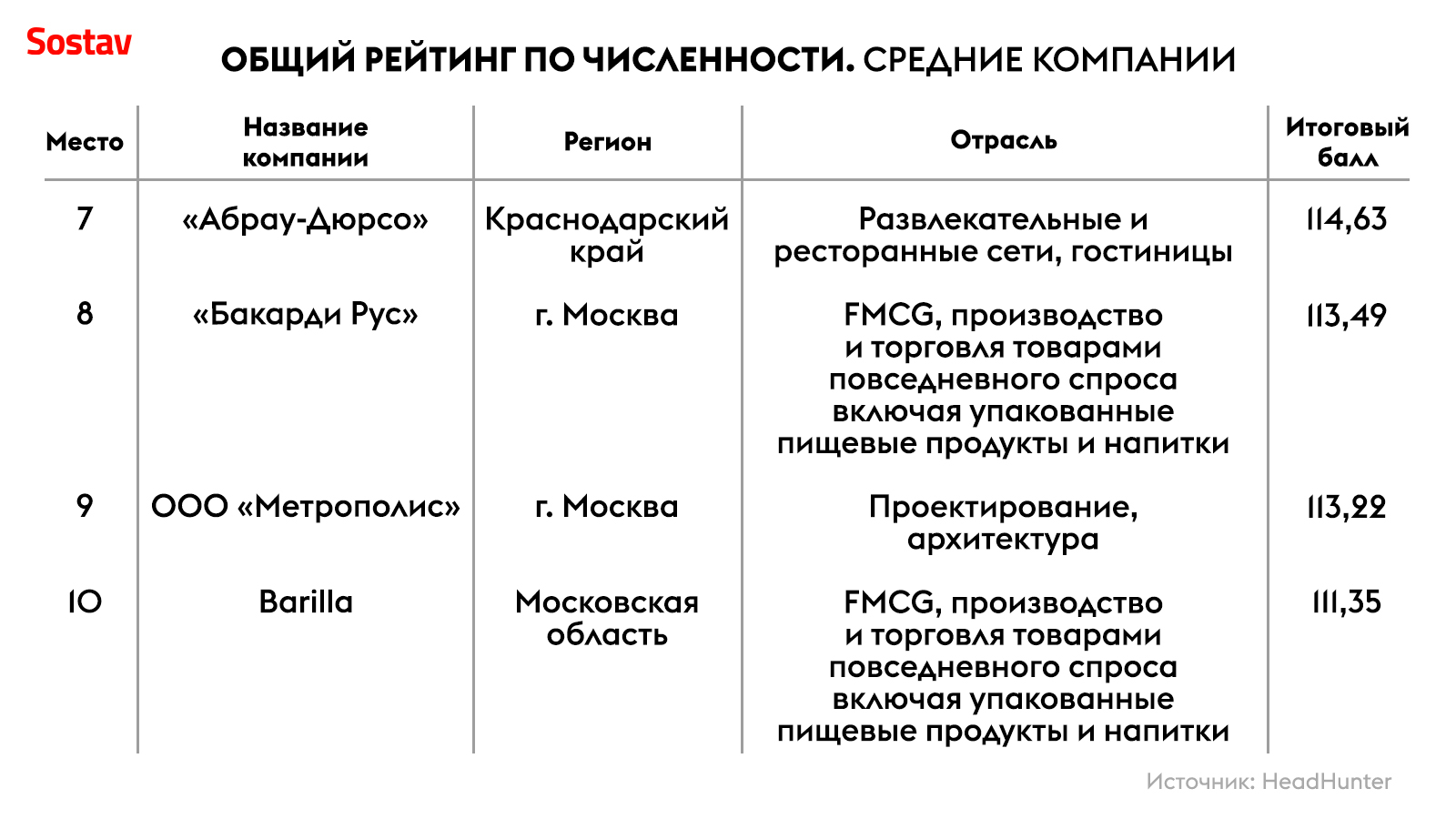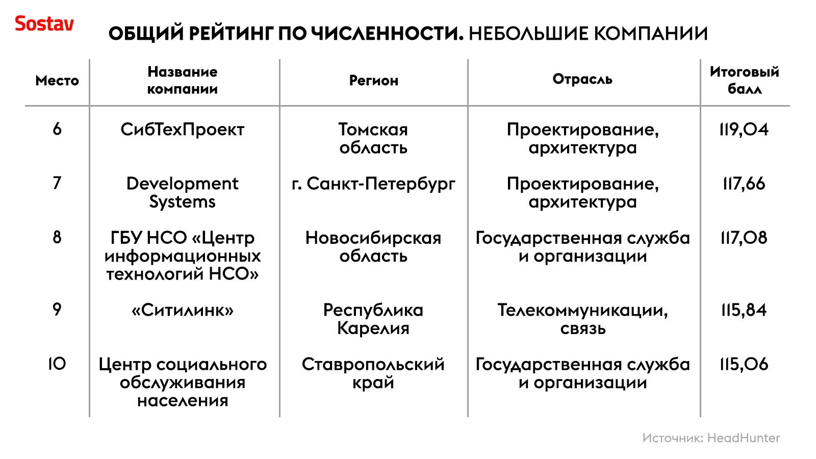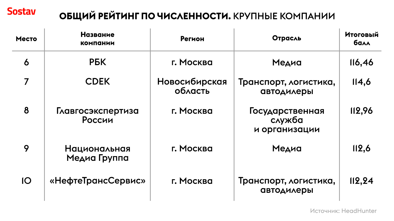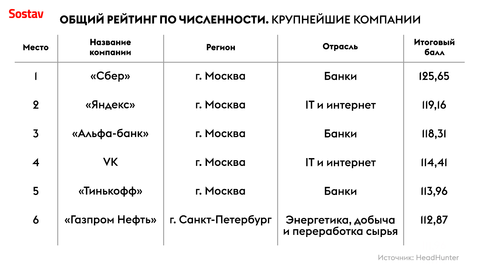 В десятку рейтинга крупнейших работодателей вошли сразу четыре банковских структуры: «Сбер», «Альфа-Банк», «Тинькофф» и ВТБ. Также в топ-10 оказались два сотовых оператора: Tele2 и МТС — они прибавили по одной позиции по сравнению с прошлогодним рейтингом. «Сибур» прибавил сразу шесть строчек и занял восьмое место, а «Газпром нефть» потерял три позиции, опустившись на шестую строчку с третьей.