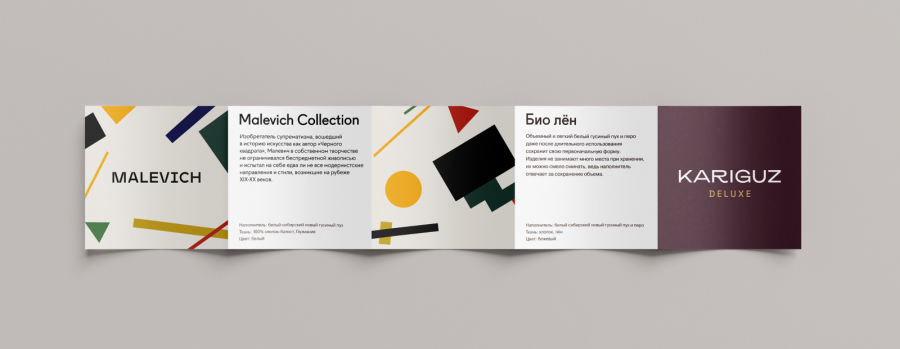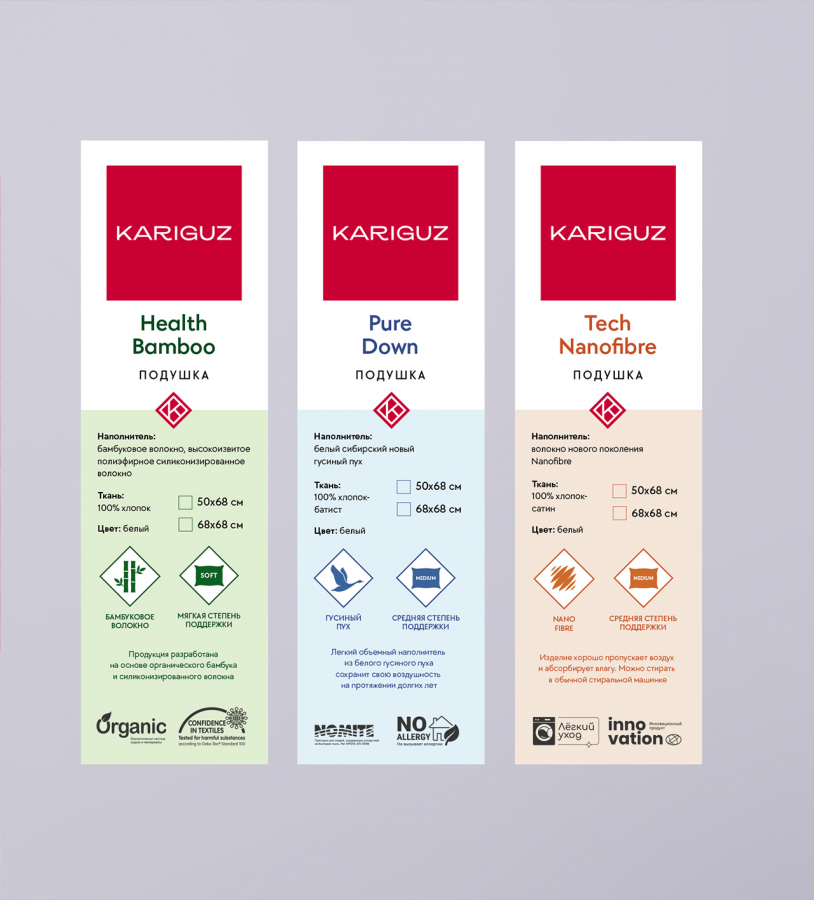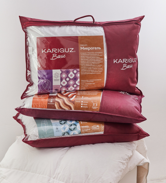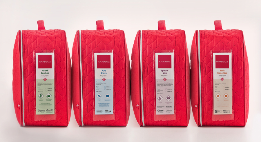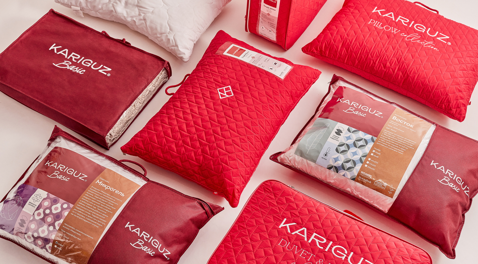 Kariguz Basic. Это самая доступная линейка товаров с разными наполнителями — от гусиного пуха до современных синтетических материалов. В качестве названий продукции мы предложили использовать топонимы, которые указывают на происхождение наполнителя. Например, названия подушек и одеял «Хетта» и «Танама» говорят о «родине» изделий из гусиного пуха, а «Юста» и «Толга» — из верблюжьей шерсти. Так мы подчеркнули, что продукция сделана из экологичных российских материалов.