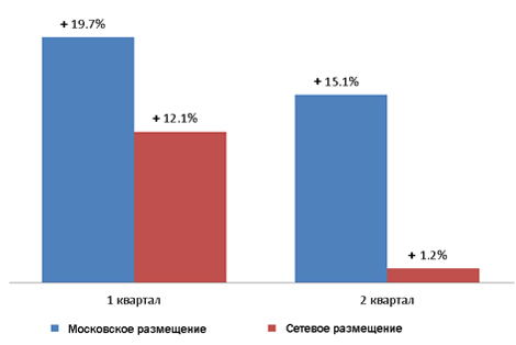 Рост бюджетов классической рекламы при московском и сетевом размещении во 2-м квартале составил +8%. Причем, как в 1-м, так и во 1-м кварталах этот рост обеспечило в основном московское размещение.
