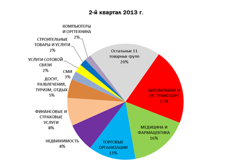 Как видно из Таблицы 1, даже самые значимые группы рекламодателей радио вели себя во 2-м квартале 2013 г. очень по-разному. Хотя, при этом список десяти крупнейших товарных групп рекламодателей радио остался с прошлого года почти без изменений.