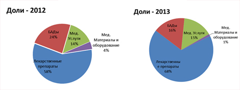 Из сравнения распределения рекламных денег внутри категории также видно, что во 2-м квартале 2013 г. лекарственные препараты приросли том числе и за счет сокращения доли рекламы БАДов. Также свое присутствие на радио увеличила подкатегория рекламодателей медицинских услуг.