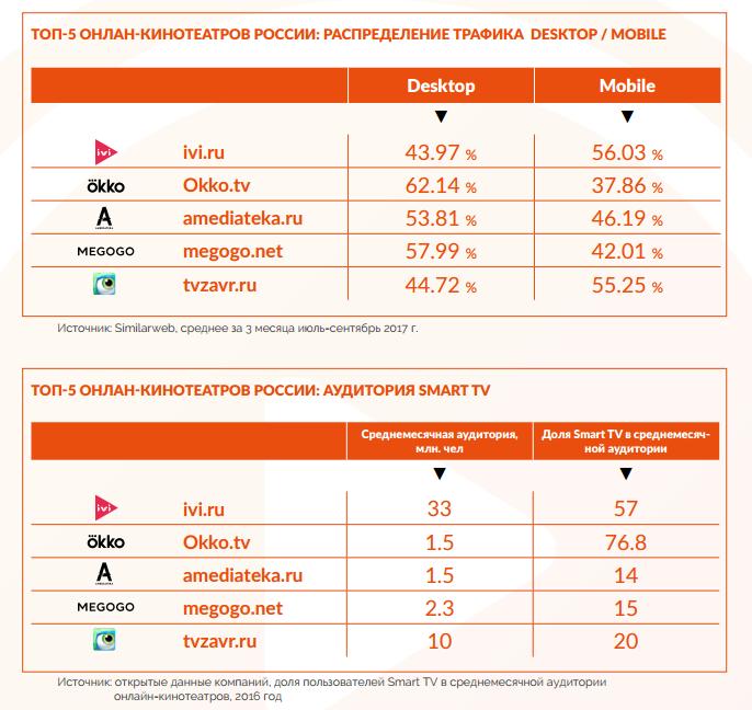По оценкам экспертов на конец 2016 года парк Smart TV в России составлял 13,8 млн. устройств, из которых 69% были подключены к интернету. Лидером по доле аудитории Smart TV в среднемесячной аудитории является онлайн-кинотеатр Okko: при общем размере среднемесячной аудитории 1,5 млн. человек доля аудитории Smart TV у Okko составляет 76,8%.