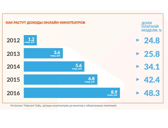 Большинство экспертов и представителей онлайн-кинотеатров отмечают рост числа платящих за контент пользователей, несмотря на то, что большинство крупных онлайн-кинотеатров, присутствующих на российском рынке, используют преимущественно модель монетизации посредством рекламы. Так, в первом квартале число платящей аудитории составило 3 млн. человек, а количество платных транзакций за 2016 год составило 15-20 млн. В целом, в 2016 году общий размер пользовательских платежей в российских онлайн-кинотеатрах составил 2,34 млрд рублей.