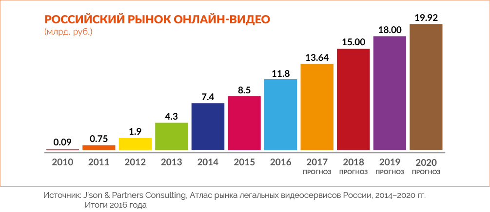 Аудитория онлайн-видео в России составила 69,3 млн. человек или 47% населения на конец 2016 года. Эксперты также отмечают рост аудитории легальных онлайн-кинотеатров России. Сегодня она составляет 39,6 млн человек, а в 2013 году она составляла 21,7 млн человек.
