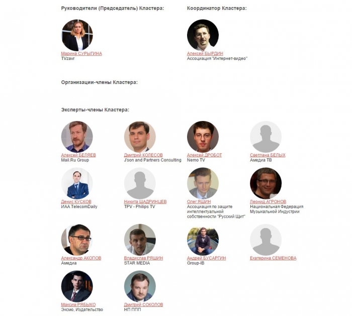Председателем кластера "Медиа" является, как уже отмечалось выше, глава TVzavr Марина Суригина, координацией действий кластера и ее наиболее активным членом - Алексей Бырдин из некой Ассоциации "Интернет-видео". Связь кластера и АИВ видна невооруженным глазом: в разделе новости дублируются все инициативы кластера, в Бырдин числится в АИВ в качестве генерального директора.