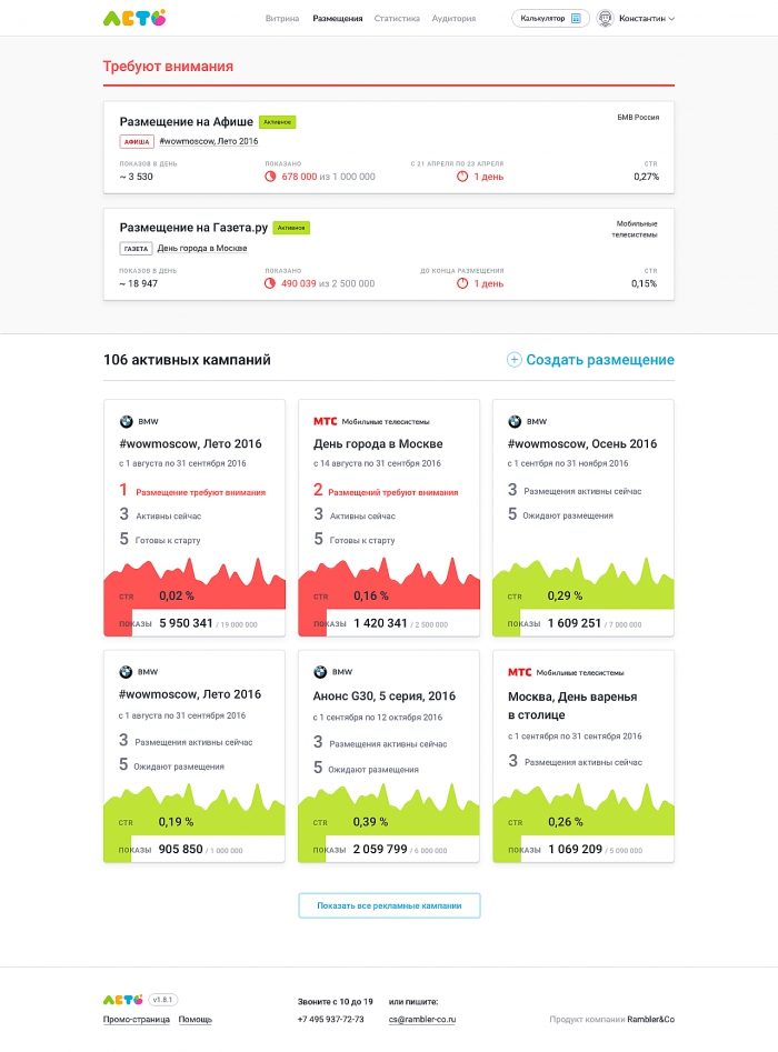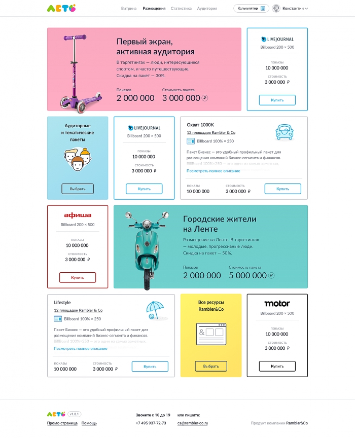 «Сейчас в сервисе представлены как аудиторные продукты, когда агентство или клиент может приобрести конкретную аудиторию для маркетинговых задач, например, часто летающих пассажиров или мам с детьми, так и отдельные площадки группы компаний Rambler&Co, и все это в разрезе desktop & mobile платформ. В ближайшее время в сервисе появятся практически все маркетинговые возможности группы компаний, а именно – native, performance, video. Всего будет 12 инструментов для маркетинга на всех 50 проектах компании. Также, в «Лете» можно отслеживать все специальные предложения по размещению», - рассказали представители компании.