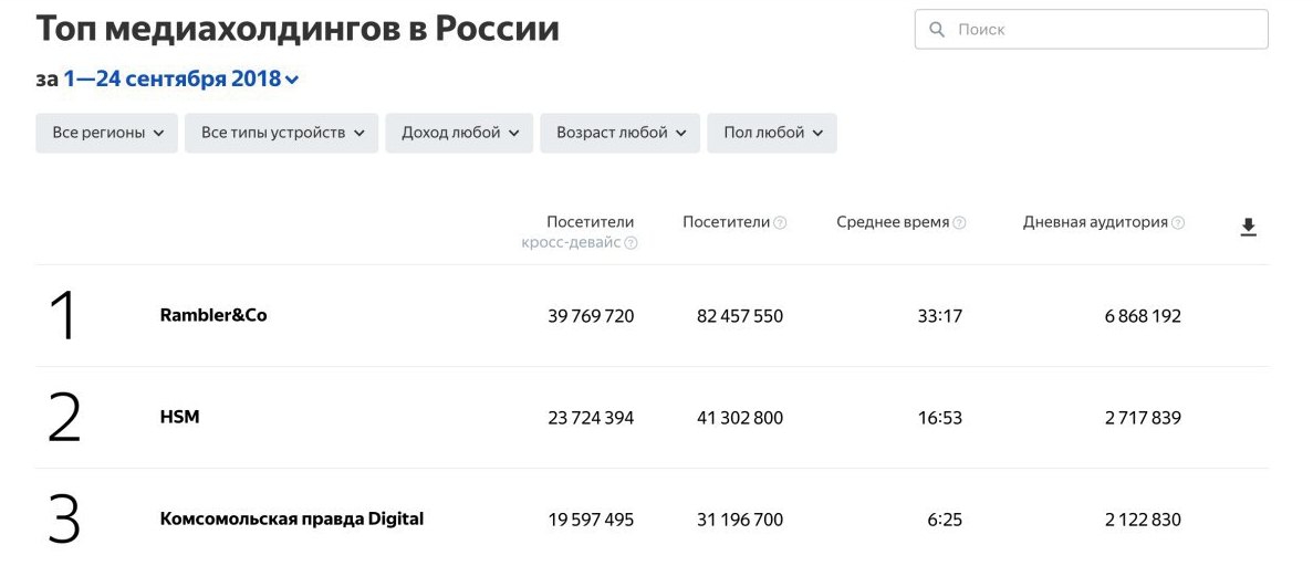 Rambler&Co, объединяющий «Рамблер», «Лента.ру», «Афиша», «Газета.ру», «Чемпионат.com» и другие ресурсы, занимает первое место по объему интернет-аудитории среди российских медиахолдингов. В текущем месяце (здесь и далее с 1 по 24 сентября 2018 года) совокупное количество посетителей площадок Rambler&Co составляет 82,4 млн, а с учетом пересечения аудитории на разных платформах и устройствах (кросс-девайс) — 39,7 млн. Такие данные содержатся в рейтинге «Топ сайтов» Яндекса, новом проекте измерений интернет-аудитории (есть в распоряжении Sostav).