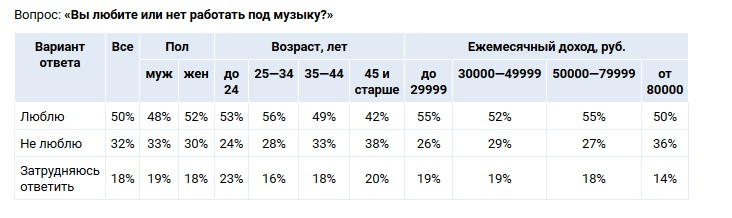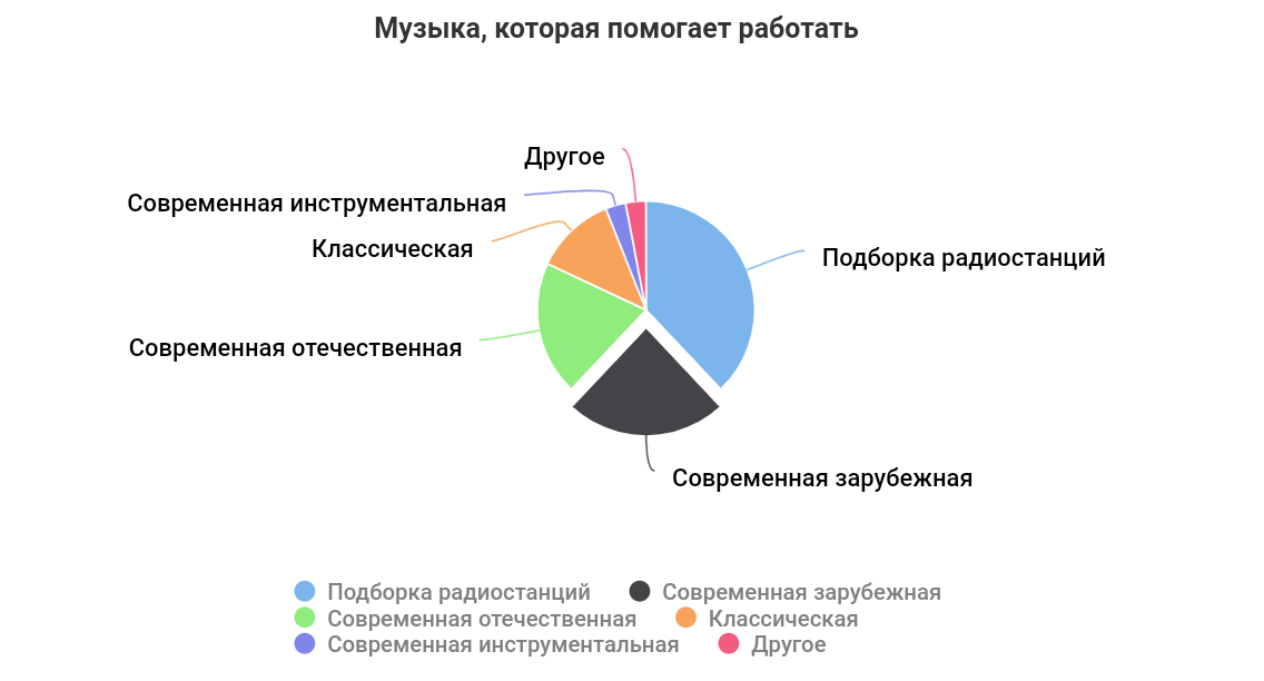 Больше всего нравится работать под музыку респондентам 25—34 лет. Каждый третий россиянин предпочитает не перегружать на работе звуковое пространство, чаще всего это люди старше 45 лет. Среди сотрудников, слушающих музыку на работе, большинство не имеет конкретных предпочтений, выбирая композиции под настроение или слушая подборки радиостанций.