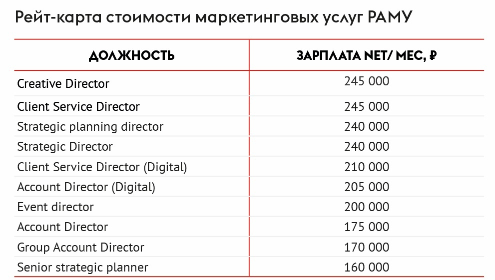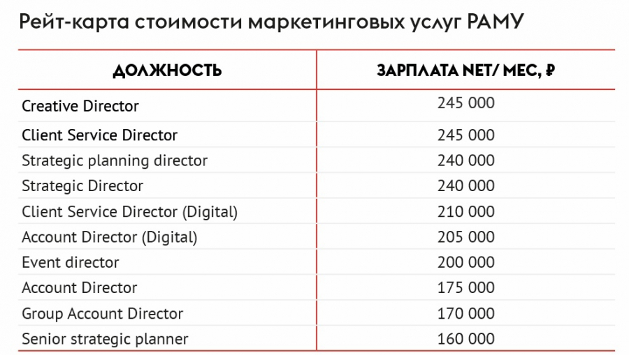Эксперты Российской ассоциации маркетинговых услуг (РАМУ) выявили, что маркетинговые агентства занижают стоимость своих услуг в смете примерно в два раза — это связано с обесцениванием их работы, что приводит к непрозрачному ценообразованию на маркетинговые услуги и падению уровня исполнения кампаний. РАМУ пришла к таким выводам после того, как составила документ, содержащий тарифы на услуги агентства, в том числе ставки по оплате работы персонала. Этот документ называется рейт-картой. Об этом Sostav сообщили в РАМУ.